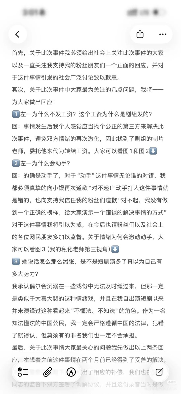 12月21日,左一发文承认对助理动手并公开道歉。在声明中,左一解释未直接发工资原因,是因事件发生后,为避免双方情绪激化,委托剧组制片老师代为转结。