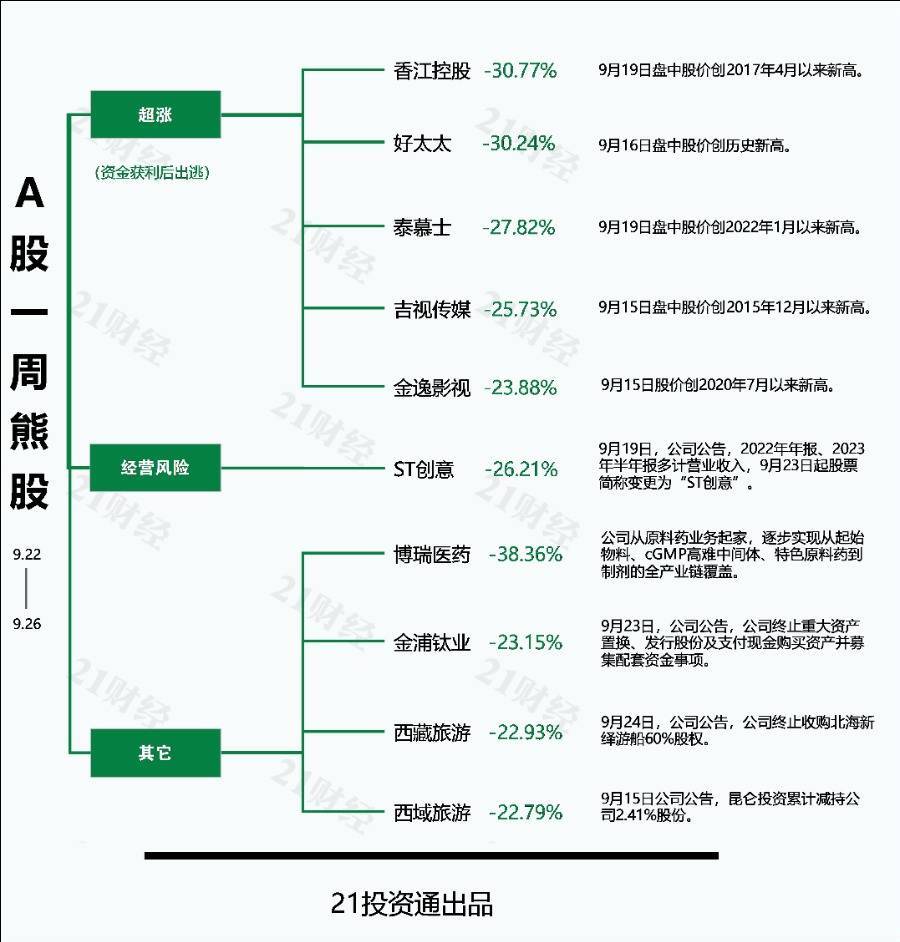 本期十大熊股中,博瑞医药(688166.SH)以38.36%的跌幅成为本期的最熊股。香江控股(600162.SH)、好太太(603848.SH)、泰慕士(001234.SZ)、ST创意(300366.SZ)等股的周跌幅均在22%以上。