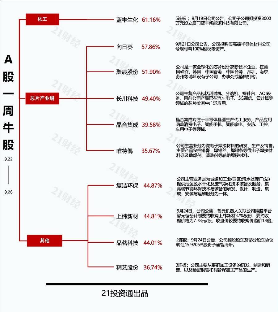 子公司成立新能源科技公司,最牛股蓝丰生化5连板本期牛股榜中,蓝丰生化(002513.SZ)以61.16%的周涨幅夺魁,向日葵(300111.SZ)以57.86%的涨幅位居第二,聚辰股份(688123.SH)、长川科技(300604.SZ)、复洁环保(688335.SH)、上纬新材(688585 SH)周涨幅超44%。本期牛股榜十只个股过去一周累计涨幅均超过35%。