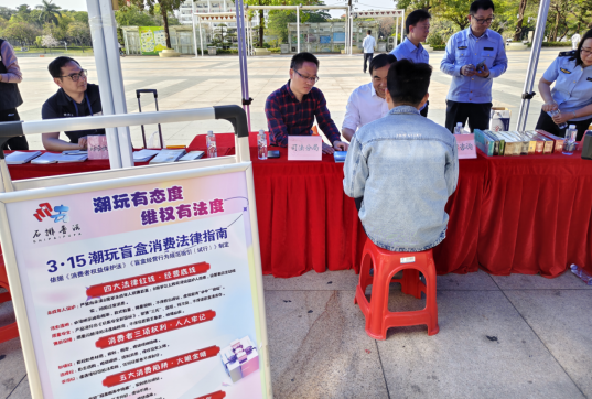 3月15日,石排司法分局在石排城市广场开展“法治护航潮玩,权益拒绝‘盲’从”潮玩盲盒消费法治宣传专场活动。